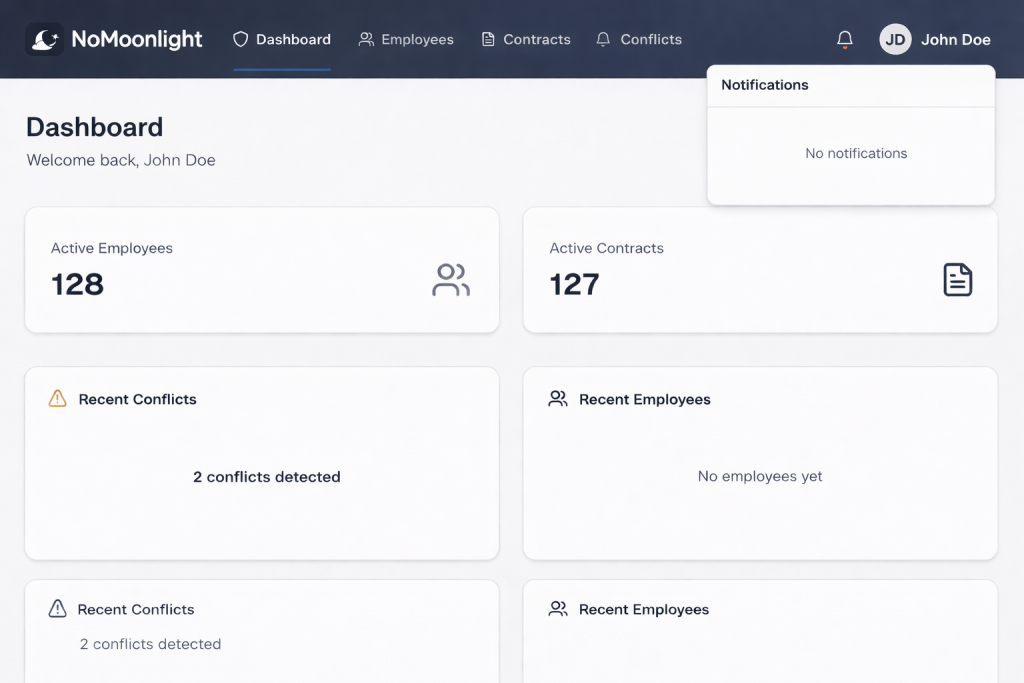 NoMoonlight is the B2B SaaS platform that helps companies identify concurrent employment and protect sensitive information through automated conflict detection and comprehensive contract management.